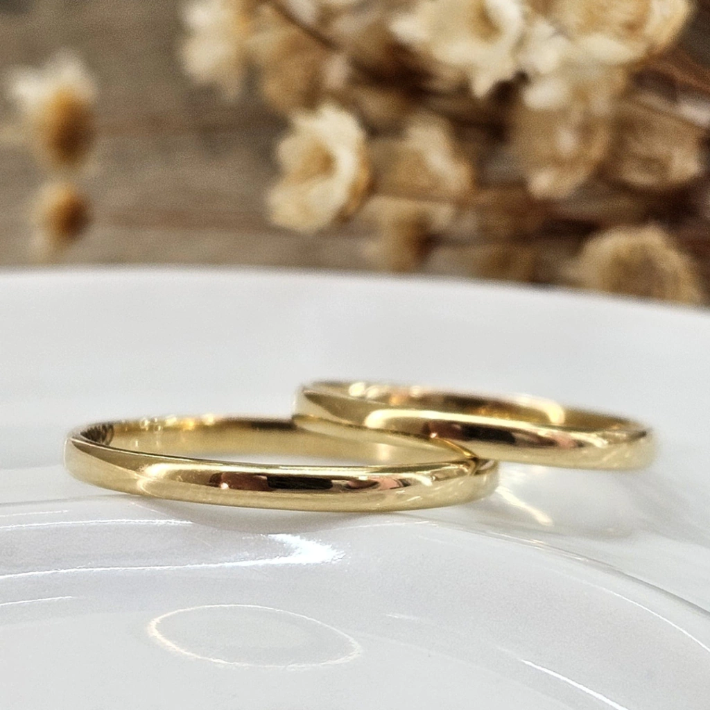 As alianças são confeccionadas em ouro 18k, possuem acabamento externo abaulado, e acabamento interno semi anatômico, com largura de 2mm. Esse design une a elegância do ouro 18k à comodidade do formato anatômico, que proporciona maior conforto no uso.